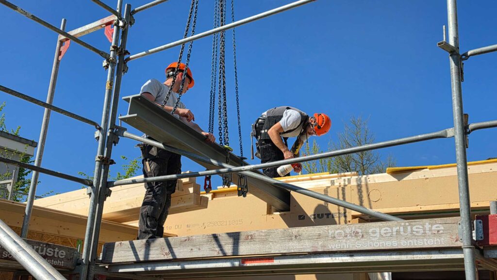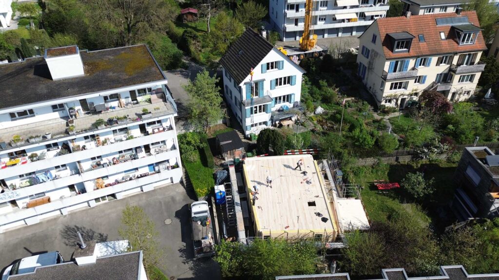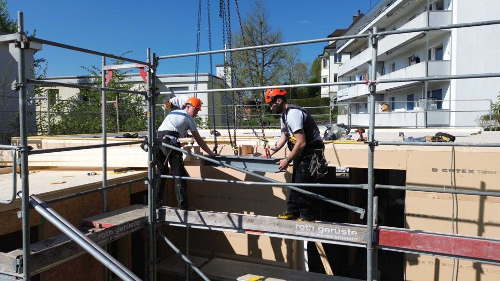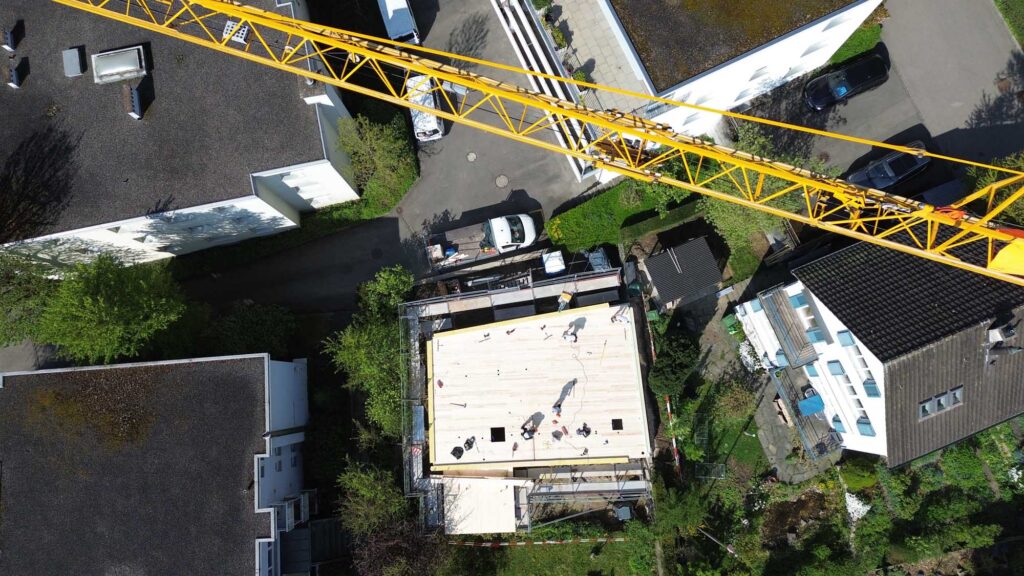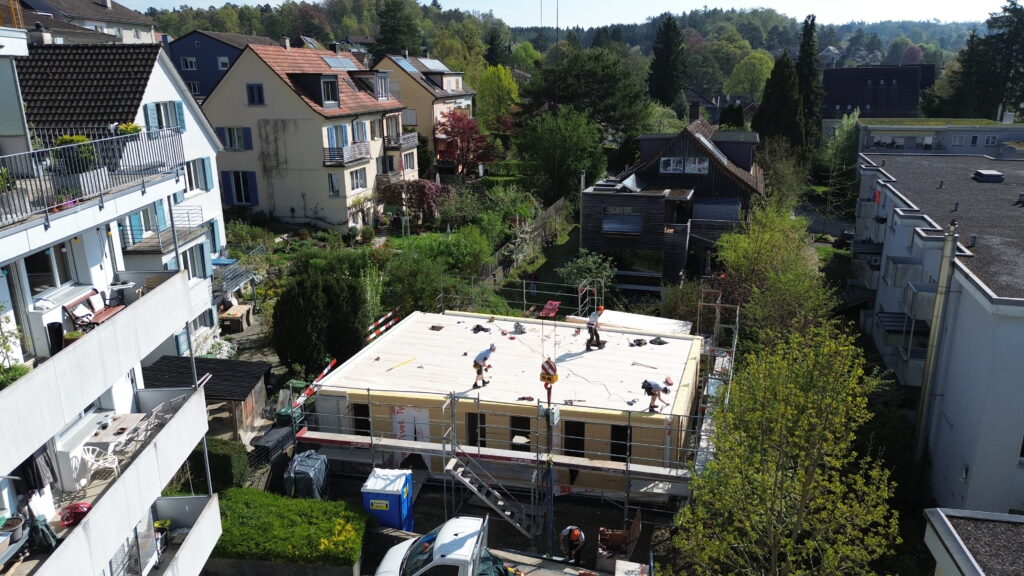 Die anschliessende Aufrichtung vor Ort konnte in lediglich zwei Tagen abgeschlossen werden – inklusive Fenster und Flachdachabdichtung. Diese Bauweise ermöglicht eine präzise Ausführung und kurze Bauzeiten.