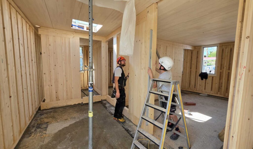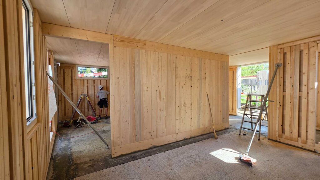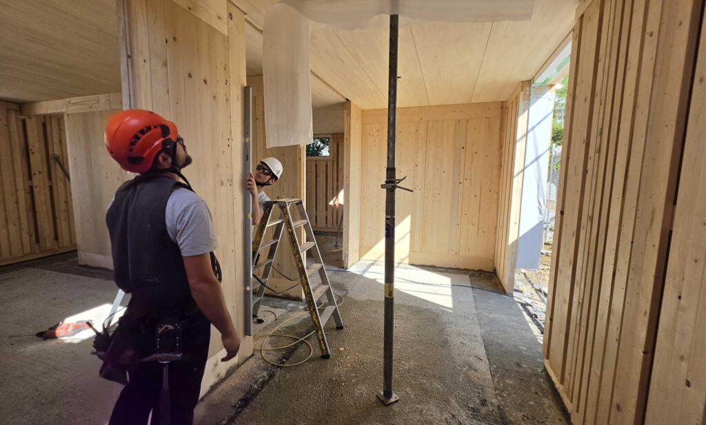 Im Innenraum erfolgt die Fertigstellung nach der Installation der Haustechnik mit Gipskarton und Verputz. Aussen erhält das Gebäude eine horizontale Fassadenverkleidung aus Fichtenholz, die dem Haus eine natürliche und zeitlose Erscheinung verleiht.